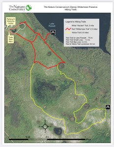 You can hike 7 miles in the preserve. The trail is color coded to Red and Yellow Loop. Red been the shorter of the two. They are well marked and you cannot get lost. Each turn there is a map that tell you where you are.